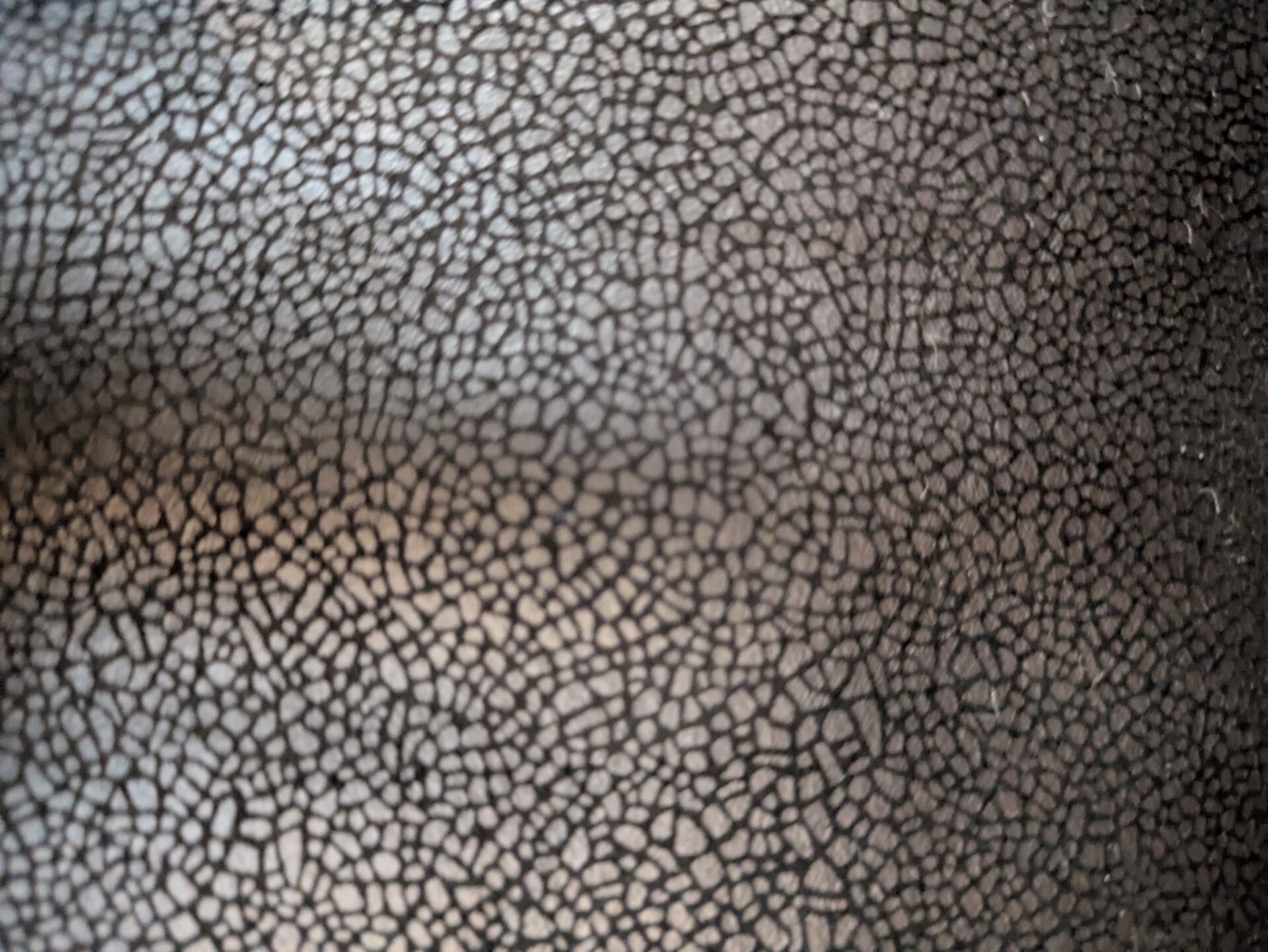 One side does have a suede effect, but the other is a faux leather, with a shiny, snakeskin appearance from a printed foil design. The two sides could be used to advantage in collar and revers, pockets, cuffs etc.