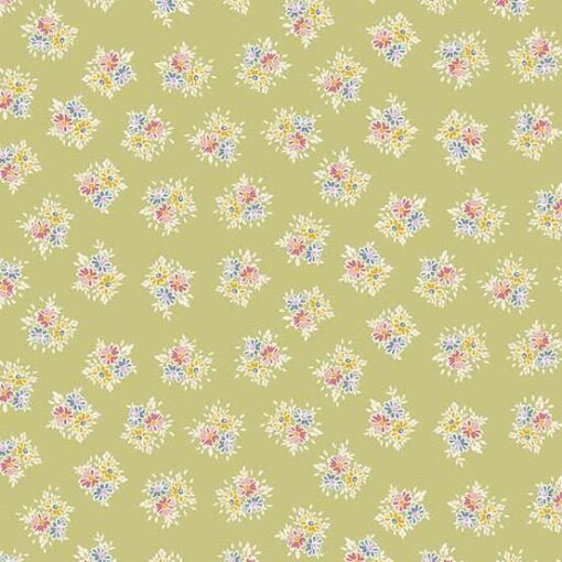 This fabric has a soft green background and regular pattern od small posies made up of multicoloured flowers.