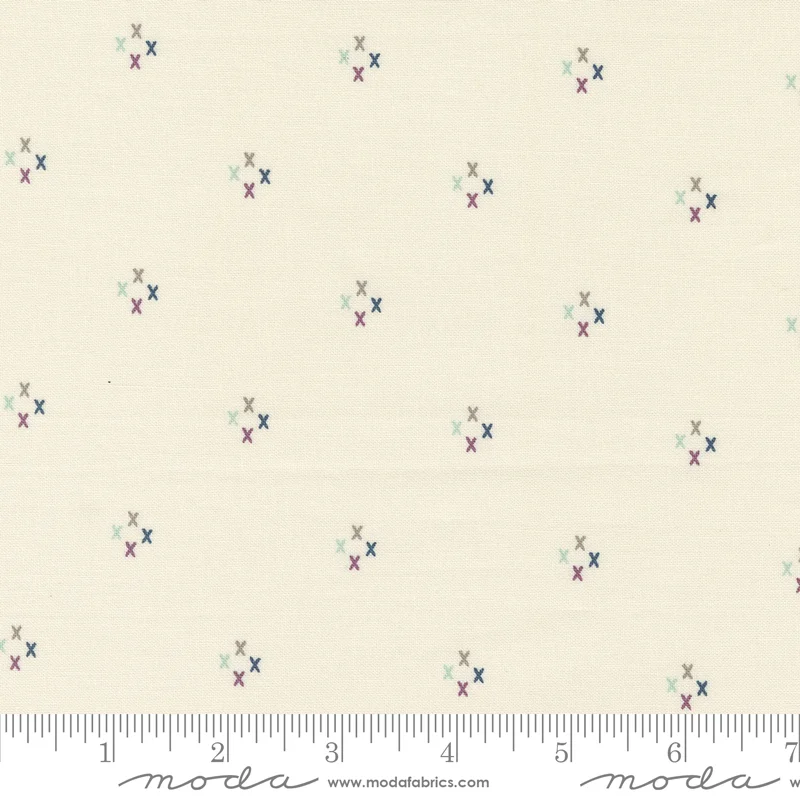 This is a geometric design of tiny cross stitches in a diamond motif, scattered across a cream background.