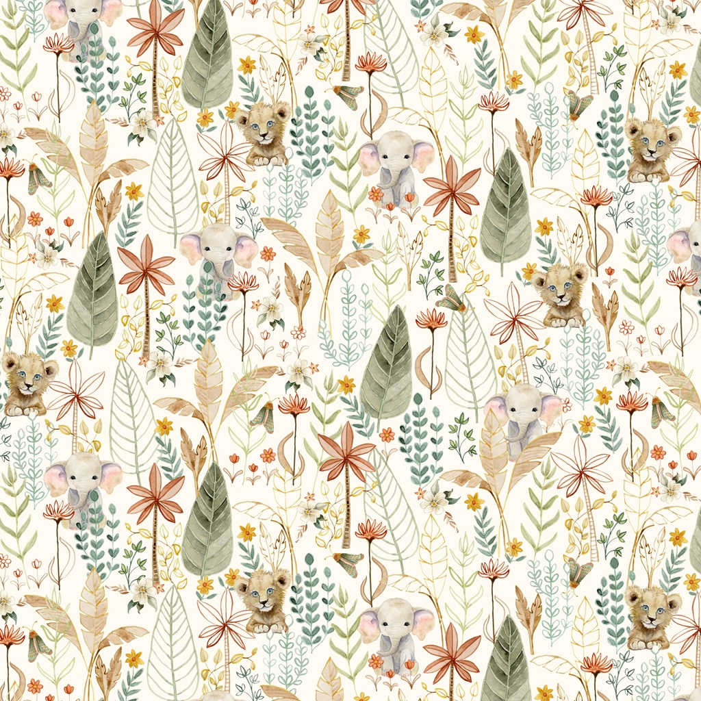 Baby elephants and lion cubs peek out from the jungle foliage.