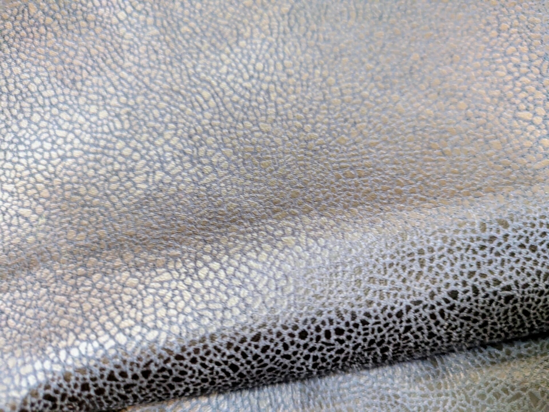 One side does have a suede effect, but the other is a faux leather, with a shiny, snakeskin appearance from a printed foil design. The two sides could be used to advantage in collar and revers, pockets, cuffs etc.